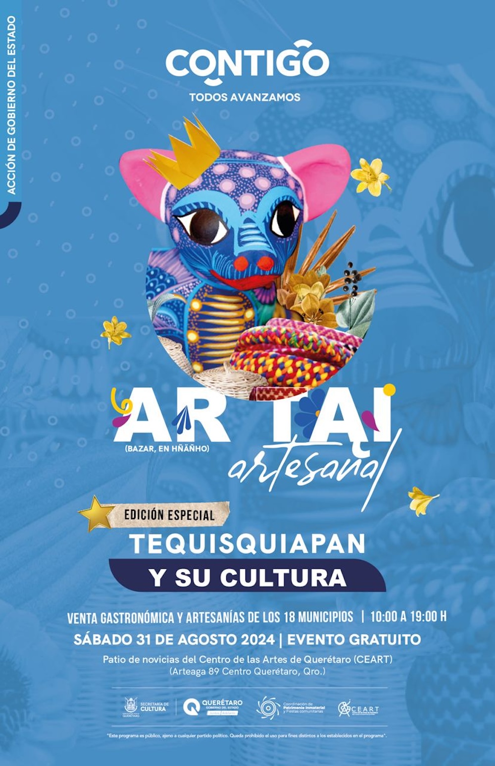 Este sábado 31 de agosto, en el Centro de las Artes de Querétaro (Ceart), se llevará a cabo la edición número 14 del Bazar Artesanal Ar Tai, con la participación de 130 artesanos de los 18 municipios del estado, en esta ocasión dedicado a Tequisquiapan.
