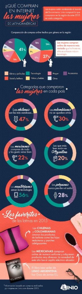 Las mujeres están cambiando el e-commerce. Según información de Comscore, el 83% de las compras por Internet son influenciadas por ellas. Actualmente, el 45% de las compras en Linio son hechas por mujeres y se estima que para finales de este año, esta cifra ascienda a 52%. Pero, ¿qué es lo que ellas quieren? Linio comparó la manera en la que las mujeres latinoamericanas compraron online durante 2015.
