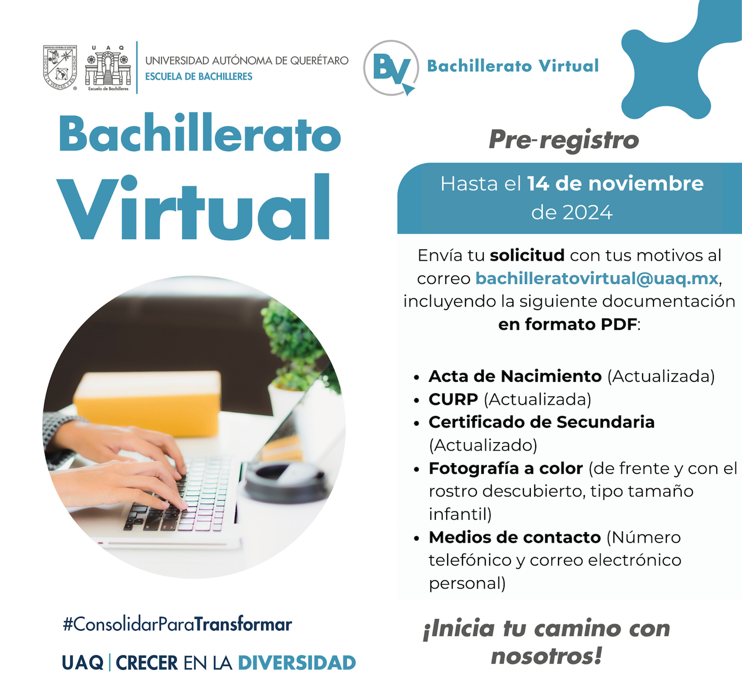 La Escuela de Bachilleres (EB) de la Universidad Autónoma de Querétaro (UAQ) abrió el prerregistro del programa de Bachillerato Virtual para el ciclo 2025-1. Las personas interesadas en cursar dicho programa pueden enviar su solicitud de motivos, acompañada de los documentos requeridos a partir de hoy y hasta el 14 de noviembre al correo bachilleratovirtual@uaq.mx.