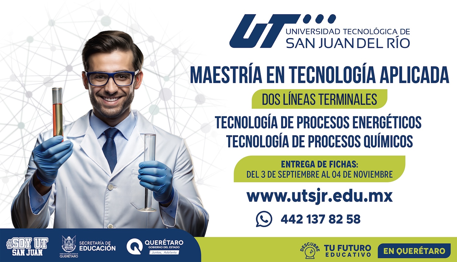 A partir de este martes 3 de septiembre, la Universidad Tecnológica de San Juan del Río abre la plataforma de registro para que los interesados en cursar la Maestría en Tecnología Aplicada obtengan su ficha para el examen de selección a través de la página www.utsjr.edu.mx; además pone a disposición el número 442 137 8258 para solicitar mayor información vía Whatsapp.