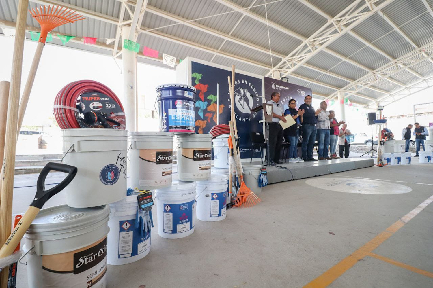 El presidente municipal, Roberto Cabrera Valencia, y la coordinadora del programa “Adelante Mi Querido San Juan”, Judith Ortiz Monroy, hicieron la entrega de materiales para la rehabilitación y mantenimiento de la primaria, la casa ejidal y plaza comunitaria de la comunidad de San José Galindo.