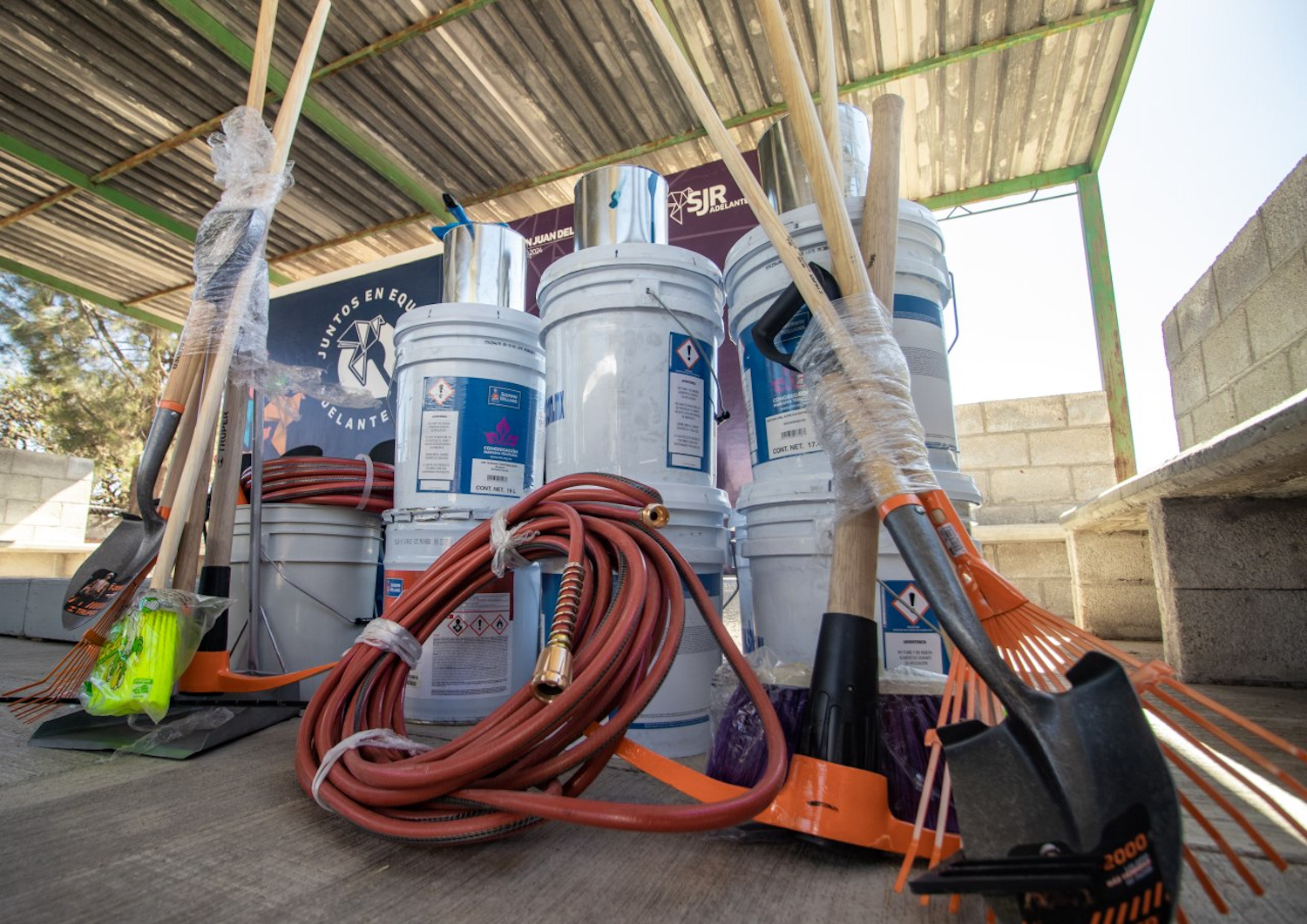 Durante el evento, al jardín de niños “Bertha Domínguez Martínez” se le entregaron dos galones de esmalte alquidálico, colores azul rey y rosa; un galón de pintura de esmalte secado rápido en color blanco; un kit de jardinería; una cubeta de pintura vinílica rosa, y dos cubetas de pintura vinílica aperlada. Este material beneficiará a 80 alumnos.