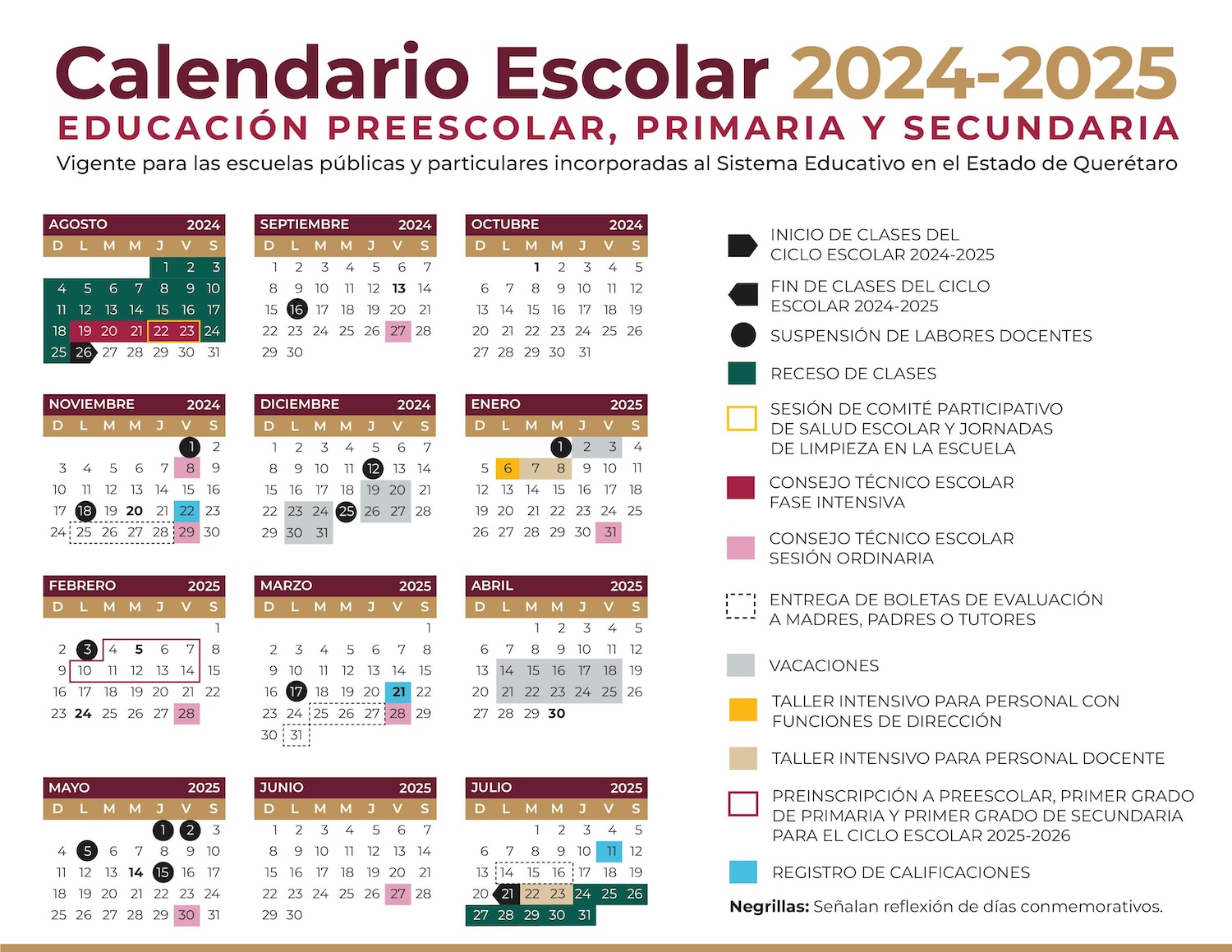 Para preservar las tradiciones mexicanas y prevenir una interrupción en el servicio educativo de las comunidades escolares, se establecen como días inhábiles el viernes 1 de noviembre y el jueves 12 de diciembre de 2024; así como el viernes 2 de mayo de 2025. El inicio del ciclo escolar 2024-2025 será el lunes 26 de agosto y concluirá el lunes 21 de julio de 2025.