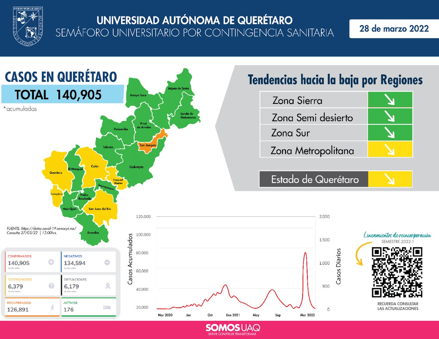Refiriendo la curva epidemiológica construida por la UAQ para la entidad, indicó que se tienen poco más de 630 casos hasta el 23 de marzo y el resto de los indicadores van a la baja, por ejemplo, se registró una disminución importante de 45 por ciento de casos activos, mientras que la positividad general es del 10 por ciento. En este mismo contexto, la Rectora compartió que los municipios del estado de Querétaro están mayormente en amarillo y verde por número de casos, siendo la excepción San Joaquín que registró un repunte y registra color naranja.