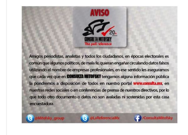 Consulta Mitofsky alertó que en épocas electorales es común que algunos políticos, de mala fe, quieran engañar circulando datos falsos utilizando el nombre de empresas profesionales, como ocurrió este domingo.