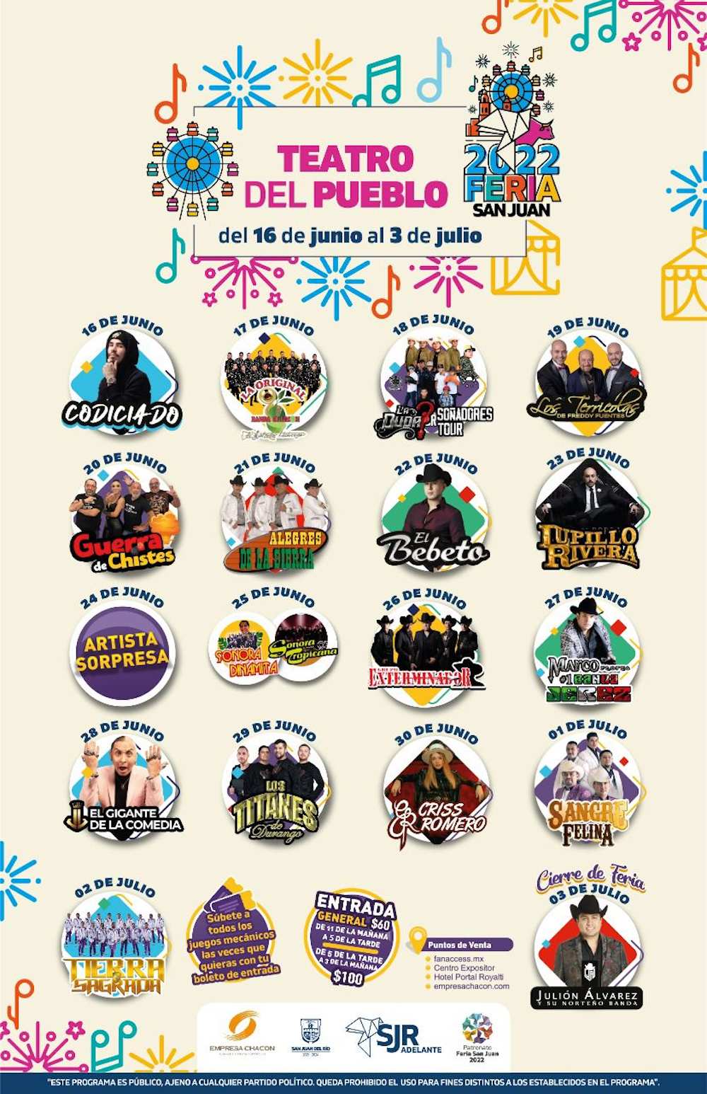 En rueda de prensa, se informó que los visitantes al tradicional recinto sanjuanense disfrutarán de la variedad de artistas como Lupillo Rivera, Julión Álvarez y Los Tucanes de Tijuana, por mencionar algunos.
