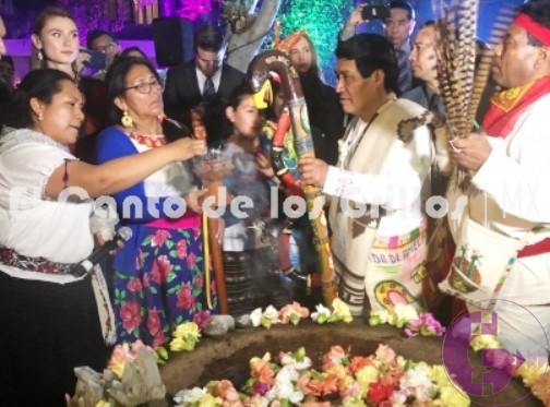Con copal, hierbas, banderas y trajes típicos de diversas regiones del país, los representantes de los grupos indígenas se encuentran a la espera de que el mandatario suba al escenario.