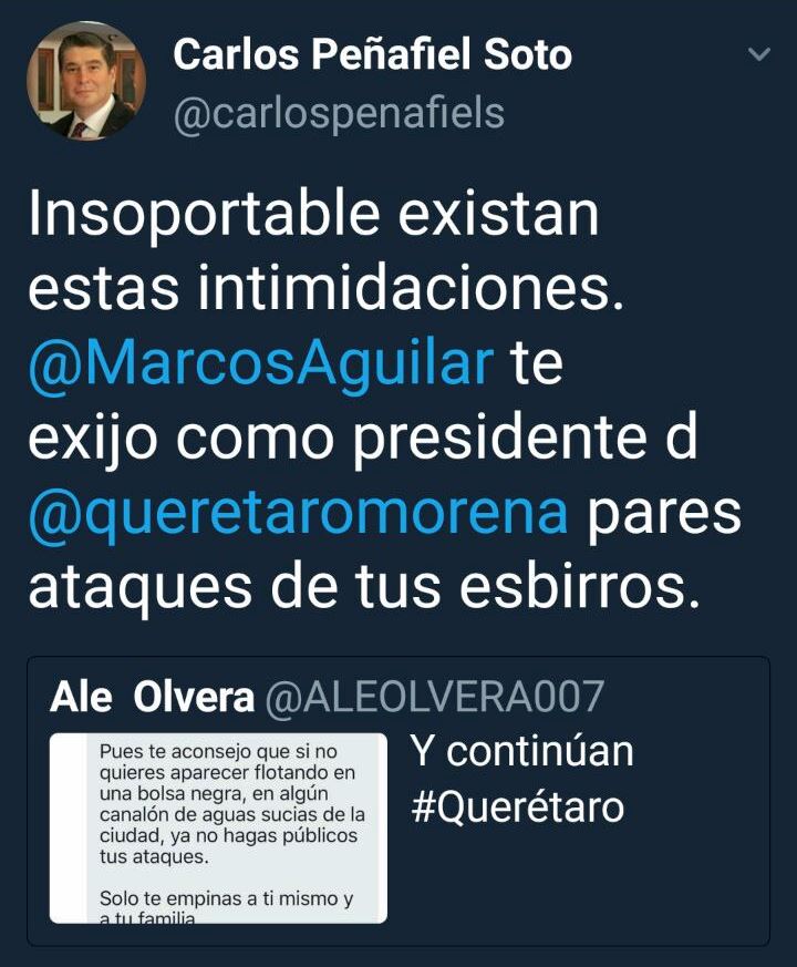 Alejandro Olvera (@ALEOLVERA007), autor de la columna política “La Cruda Verdad”, que se publica en varios medios queretanos incluyendo El Canto de los Grillos, denuncia la intimidación y amenazas de que está siendo objeto en la red social Twitter y acusa al presidente municipal capitalino, Marcos Aguilar Vega, de ser el promotor de dicho ataque.