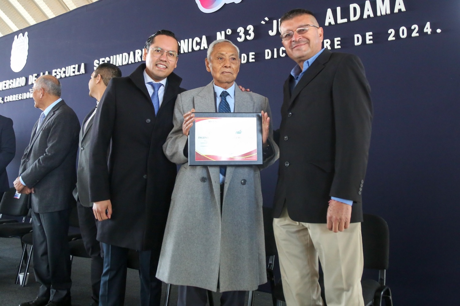 El presidente municipal de Corregidora, Chepe Guerrero, anunció la construcción de una aula-cocina para el próximo año en beneficio de los alumnos de la Escuela Secundaria Técnica número 33 “Juan Aldama” en la colonia Los Ángeles, donde develó una placa conmemorativa por el 30º aniversario.