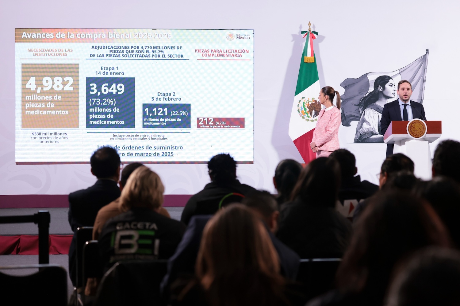 La presidenta de México destacó que como parte de la Compra Consolidada de Medicamentos e Insumos Médicos 2025-2026 ya se tienen adjudicadas de manera exitosa el 95.7 por ciento de las 4 mil 982 millones de piezas que se requieren, por lo que en marzo comienza el abasto en hospitales y clínicas.