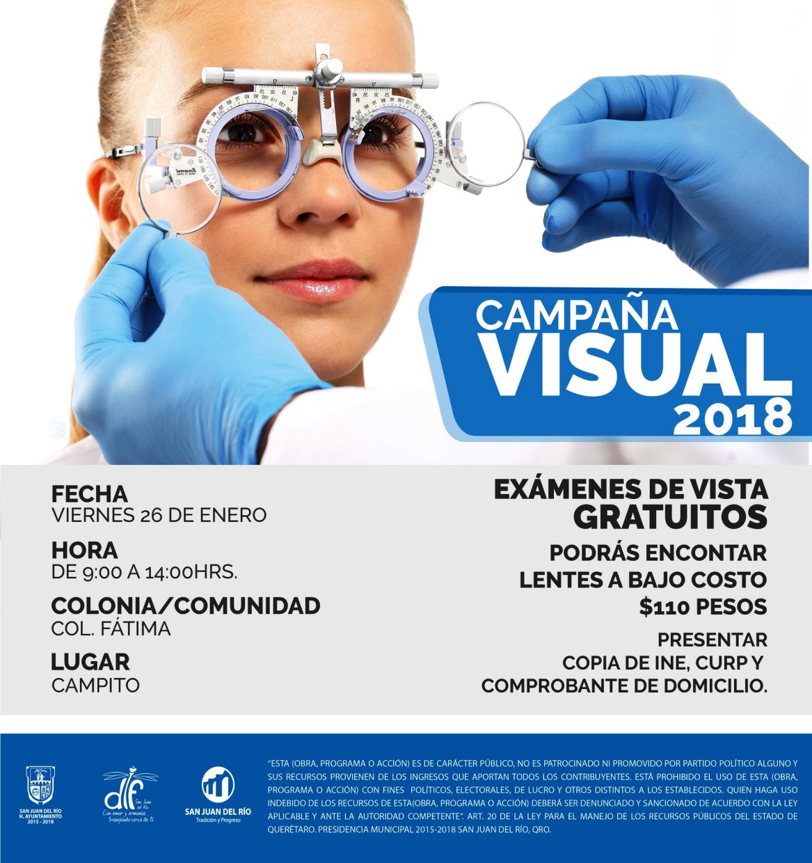 Con la finalidad de brindar atención a problemas visuales y mejorar la calidad de vida de las personas de escasos recursos, el Sistema Municipal para el Desarrollo Integral de la Familia (DIF) de San Juan del Río, a cargo de la Sra. Male Ruiz, realizará la segunda edición de la Campaña Visual 2018, a través de la cual se ofrecerán de manera gratuita exámenes de la vista y lentes a bajo costo, en por lo menos 20 colonias y comunidades del municipio.