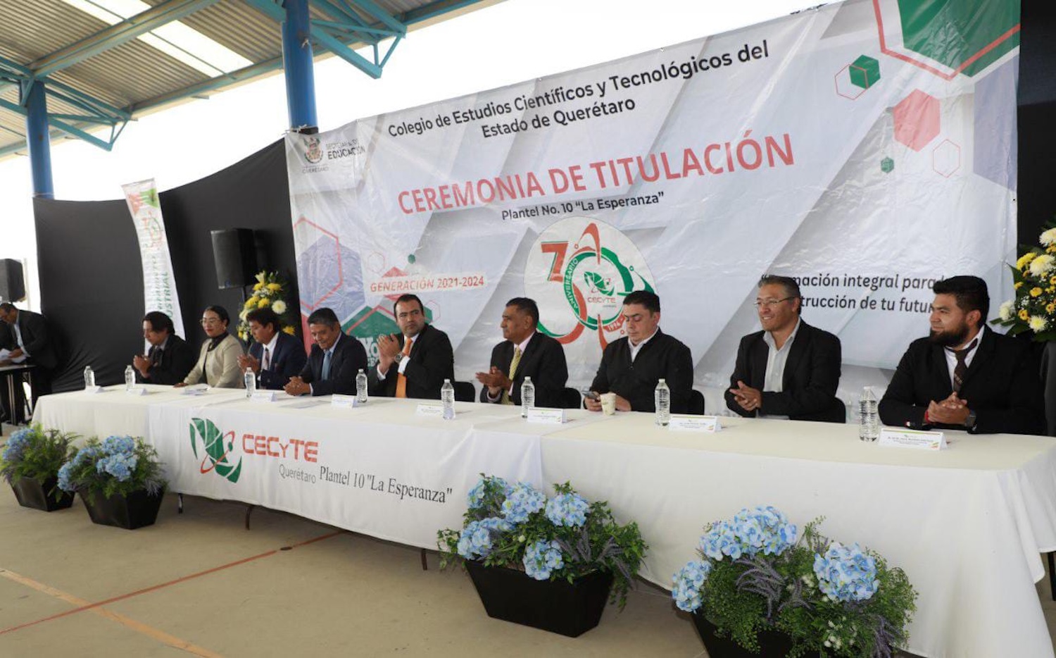 El presidente municipal de Colón, Gaspar Trueba Moncada, encabezó la ceremonia de graduación de 89 alumnos que concluyeron sus estudios en Mantenimiento Industrial y en Procesos de Gestión Administrativa del Colegio de Estudios Científicos y Tecnológicos del Estado de Querétaro (Cecyteq), Plantel número 10 “La Esperanza”.