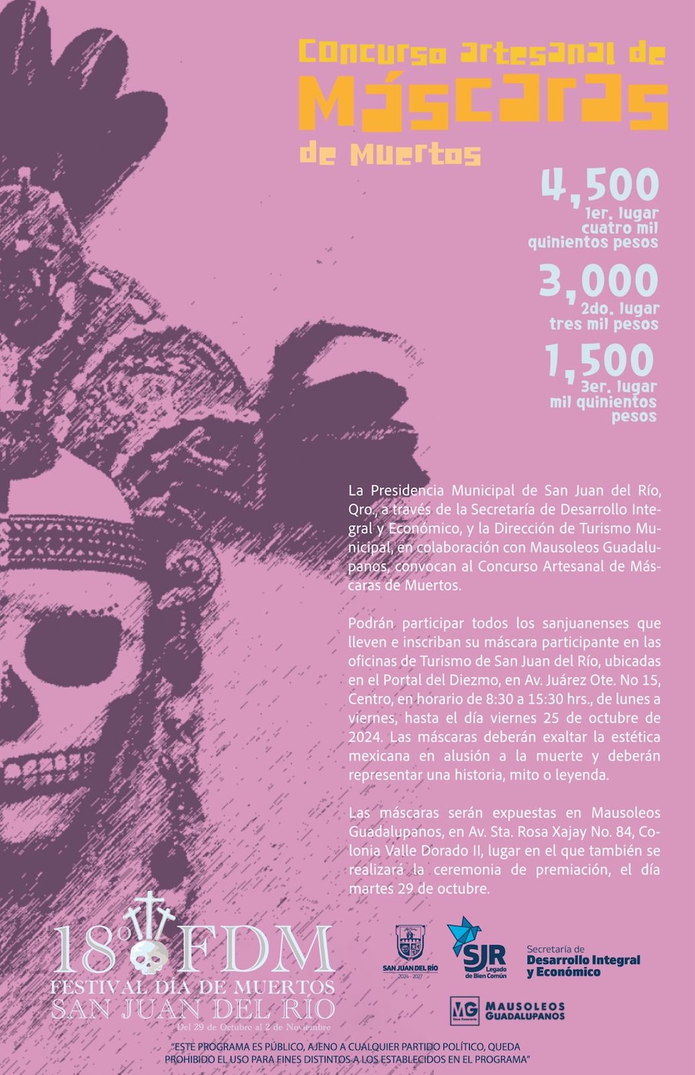 Del martes 29 de octubre al domingo 3 de noviembre se llevará a cabo el 18º Festival de Día de Muertos en el municipio de San Juan del Río, el cual contempla más de 50 actividades para que las familias sanjuanenses, así como los visitantes las disfruten, informó el presidente municipal de San Juan del Río, Roberto Cabrera Valencia.