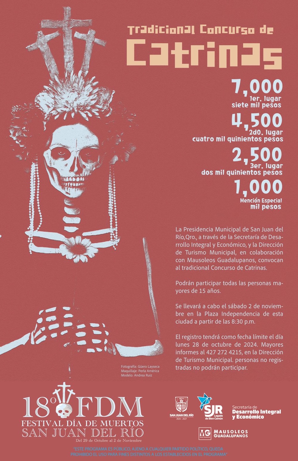 María Guadalupe Gómez informó que este año se realizarán los Concursos de Máscaras, Calaveras Literarias, Infantil de Disfraces Mexicanos, Tapetes del Mictlán, de Plañideras, Catrinas, “Xentral Chef: Pan de Muerto” y la tradicional Marcha de los Muertos, cuyos premios van desde mil y hasta 8 mil pesos, así como estímulos en especie.