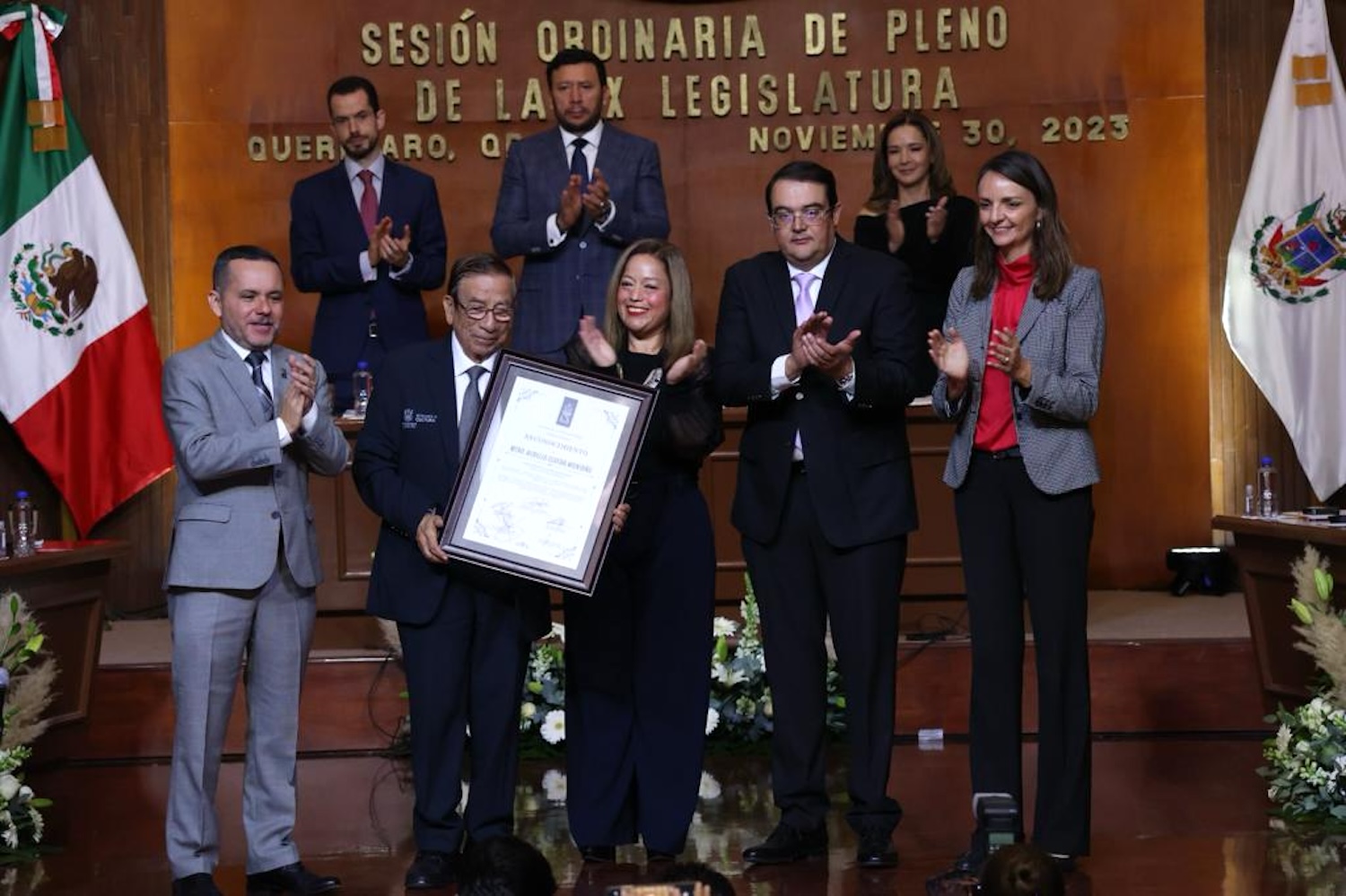 Asimismo, el presidente de la Mesa Directiva, diputado Gerardo Ángeles Herrera, y el presidente de la Junta de Coordinación Política, Guillermo Vega Guerrero, a nombre del Poder Legislativo del estado, entregaron un reconocimiento al Maestro Aurelio Olvera Montaño, quien estuvo presente en esta sesión, por su trayectoria como iniciador de esta agrupación y por su aporte cultural y musical a la entidad, misma que está cumpliendo su 80 aniversario como la Banda oficial del Estado, “lo que amerita el reconocimiento del actual Ejecutivo estatal y la sociedad queretana en general, como un factor generador de paz, coadyuvante en la formación y el desarrollo de sociedades más inclusivas, rompiendo las brechas de la desigualdad”.