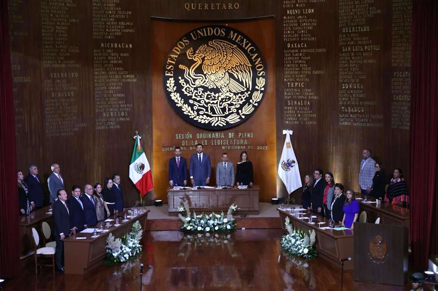 Con motivo de esta aprobación, se dieron cita en esta Sesión de Pleno de la Legislatura, representantes de diversas instituciones y estudiantes de la Telesecundaria que lleva el nombre del Maestro Aurelio Olvera de la comunidad de Santa María de Los Baños, municipio de El Marqués, y del Cobaq 15 de la comunidad de Chichimequillas; también alumnos de la Secundaria General número 1 Constitución de 1917; así como integrantes del Coro Gracias a la Vida de Adultos Mayores del municipio de Querétaro y del grupo de danzoneros que se reúnen a disfrutar de la serenata dominical a cargo de esta Banda de Música.