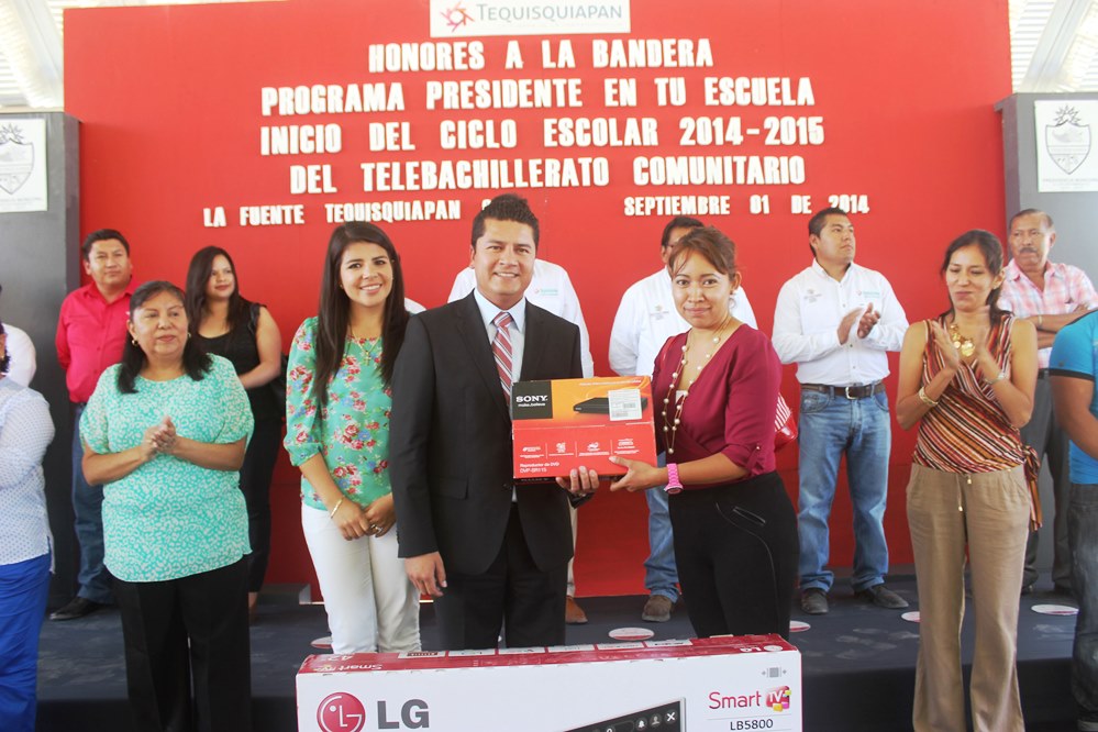 El Presidente Municipal de Tequisquiapan, Luis Antonio Macías Trejo, acompañado de su esposa, Armida Siqueiros de Macías, presidenta del Sistema Municipal DIF, encabezó el inicio de actividades del ciclo escolar 2014-2015 del Telebachillerato Comunitario ubicado en la localidad de La Fuente, en el marco de la ceremonia de honores a la bandera del programa ‘Presidente en tu Escuela’.