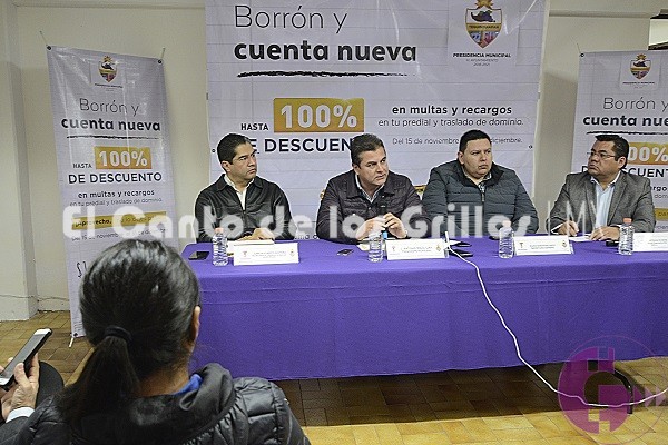 El alcalde dijo que el compromiso es regularizar las arcas municipales a través del programa, “Borrón y Cuenta Nueva”, otorgando hasta un cien por ciento de descuento en multas y recargos en el predial, del 15 de noviembre al 31 de diciembre del presente año. “Es un compromiso que hicimos con los ciudadanos de eliminar multas y recargos y además en el análisis también borrar el tema de 25% adicional a la educación y otros conceptos que a mi consideración son anticonstitucionales y que también estamos seriamente comprometidos en ayudar, para que la carga tributaria sea lo menos posible para los ciudadanos en general”, dijo.
