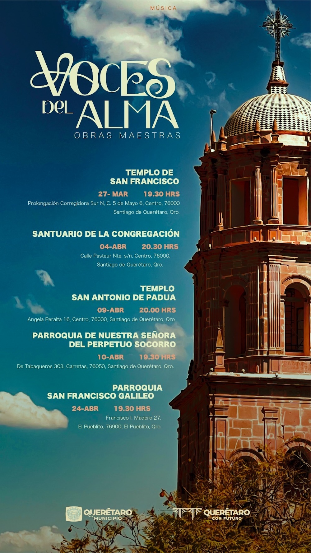 Esta serie de conciertos barrocos se llevará a cabo el jueves 27 de marzo a las 19:30 horas, en el Templo de San Francisco; el 4 de abril a las 20:30 horas, en el Santuario de la Congregación; el 9 de abril a las 20:00 horas en el Templo de San Antonio de Padua; el 10 de abril a las 19:30 horas en la Parroquia de Nuestra Señora del Perpetuo Socorro y el 24 de abril a las 19:30 horas en la Parroquia de San Francisco Galileo.