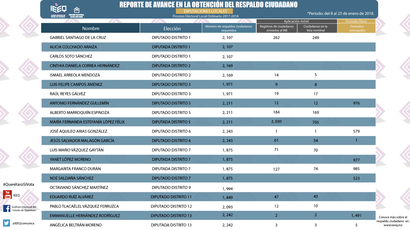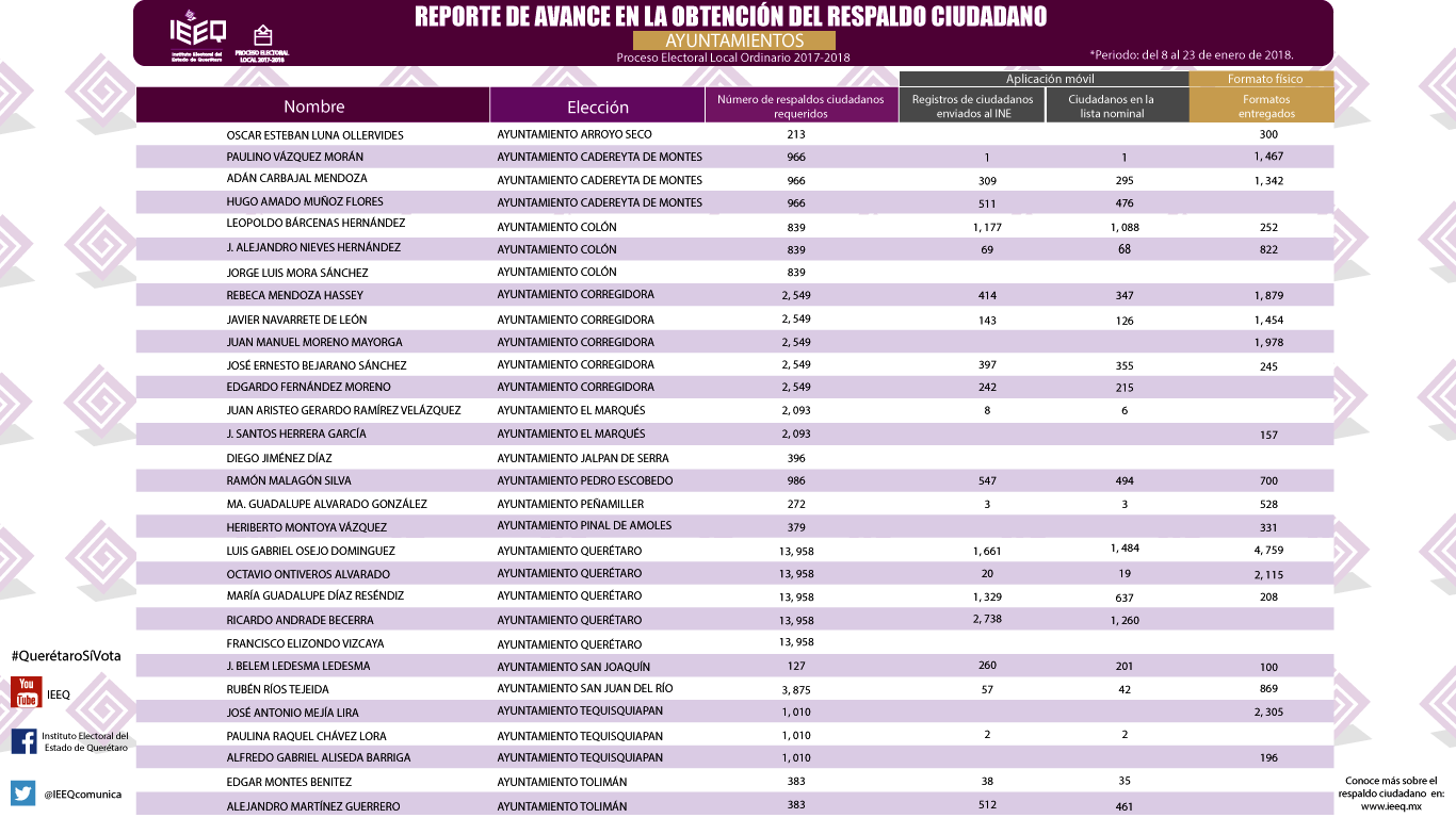El Instituto Electoral del Estado de Querétaro (IEEQ) informa que, con respecto al avance en la obtención de respaldo ciudadano para aspirantes a candidaturas independientes en el Proceso Electoral local 2017-2018, del 8 al 23 de enero del año en curso han sido registrados un total de 40,836 apoyos por 44 aspirantes.
