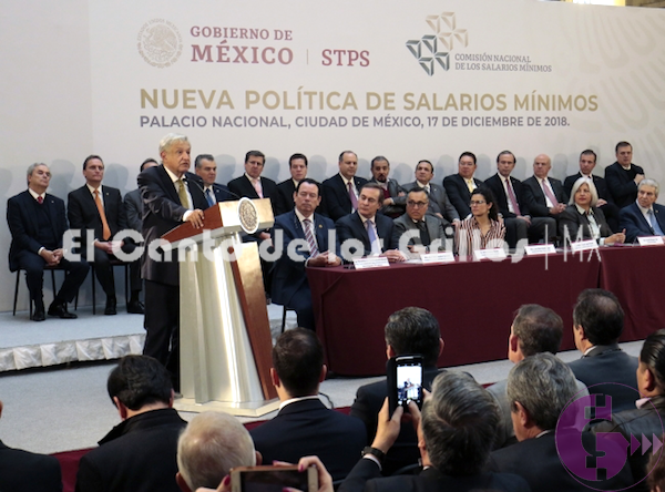 En el evento que se efectuó en el Salón Tesorería de Palacio Nacional, expresó que se procurará siempre que el salario mínimo no se fije por debajo de la inflación; que también se actúe con cautela y de manera responsable, ya que no se trata de aumentar el salario por decreto, además de tener siempre en cuenta al Banco de México para que no se dispare la inflación.