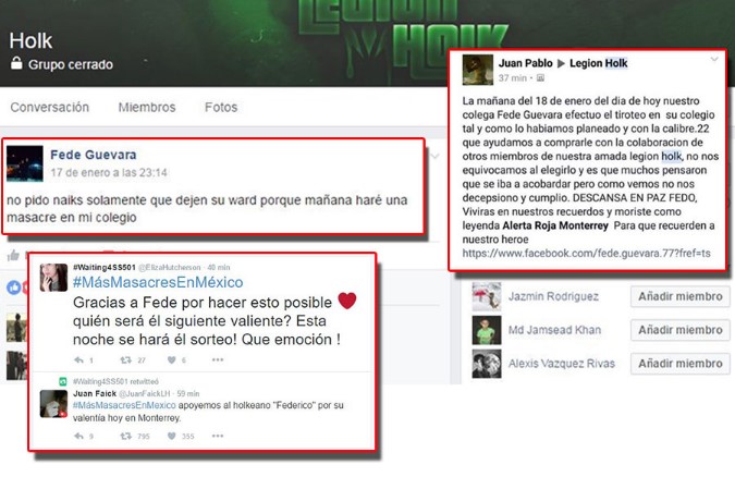 De acuerdo al portal www.lapoliciaca.com, Federico Guevara, el adolescente que disparó un arma calibre .22 contra su maestra y tres de sus compañeros para después suicidarse, anunció horas antes, en un grupo de Facebook al que pertenecía, sobre el crimen que cometería; sin embargo, ninguno de los más de 200 mil integrantes alertaron sobre el caso.