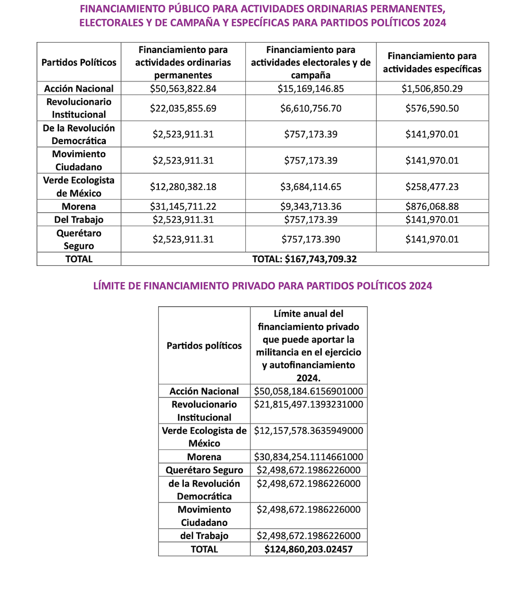 Asimismo, se determinó que del presupuesto total referido 167 millones 743 mil 709 pesos (34%) serán destinados al financiamiento público para actividades ordinarias permanentes, electorales, de campaña y específicas de los partidos políticos Acción Nacional (PAN), Revolucionario Institucional (PRI), de la Revolución Democrática (PRD), Movimiento Ciudadano (MC), Verde Ecologista de México (PVEM), Morena, del Trabajo (PT) y Querétaro Seguro (QS).