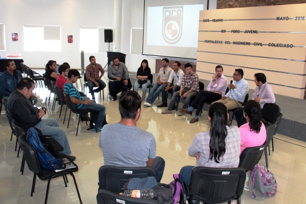 Durante los días 24 y 25 de mayo en las instalaciones del Colegio de Ingenieros Civiles se desarrollan las mesas de trabajo y diálogo de jóvenes estudiantes con ingenieros colegiados para compartir la importancia de pertenecer al cuerpo colegiado, la vinculación con profesionistas consolidados, cámaras empresariales y funcionarios públicos.