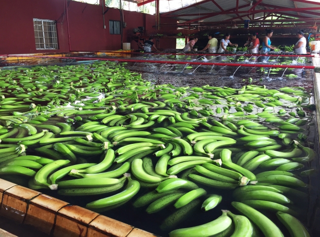 Explicó que allí se revisa la cinta de color, se revisa el grosor adecuado para exportación y la ausencia de algún golpe para pasar el proceso de desmane y selección a cargo de mujeres que depositan el banano en pilas de agua que contiene alumbre para retirarle la savia o látex al banano recién cortado.