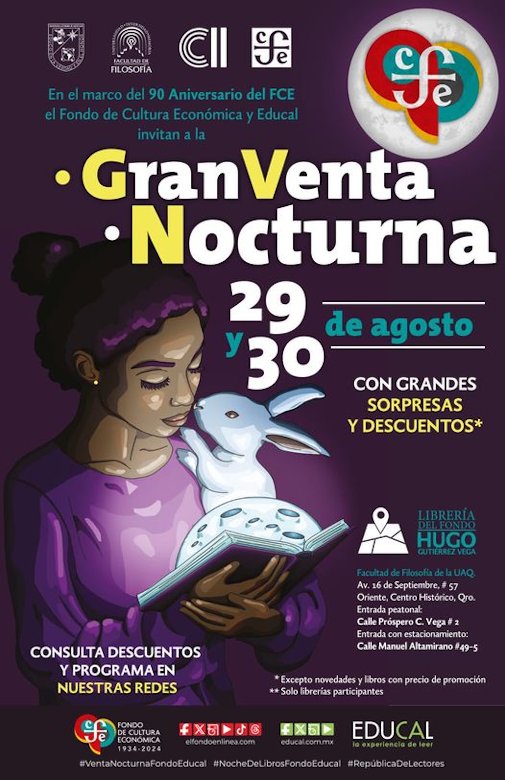 En el marco del 90º Aniversario del Fondo de Cultura Económica (FCE), la Librería del Fondo “Hugo Gutiérrez Vega” –ubicada en las instalaciones de la Facultad de Filosofía (FFi) de la Universidad Autónoma de Querétaro (UAQ)– y Educal celebrarán su Gran Venta Nocturna los próximos jueves 29 y viernes 30 de agosto con múltiples descuentos en libros a partir de las 10:00 de la mañana y hasta la media noche, a la par se realizarán una serie de actividades culturales y artísticas.
