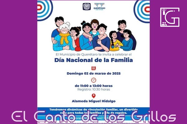 Con el objetivo de promover la unión y fortalecer los lazos familiares, este domingo 2 de marzo, el municipio de Querétaro –a través de la Comisión de la Familia del H. Ayuntamiento, el Sistema Municipal para el Desarrollo Integral de la Familia, la Secretaría de Desarrollo Social y el Instituto Municipal de la Familia– celebrará el Día Nacional de la Familia en la Alameda Hidalgo.