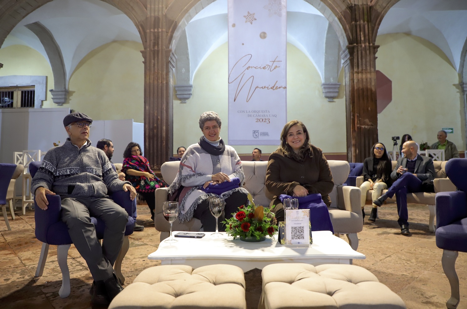 Autoridades de la Universidad Autónoma de Querétaro (UAQ) asistieron al tradicional Concierto Navideño de Gala con la Orquesta de Cámara de la UAQ, dirigida por Daniel Ortiz, acompañada por el Coro Universitario, encabezada por Elba Flores, en las instalaciones del patio principal del campus Centro Histórico. Estuvieron invitados directores de facultades y Escuela de Bachilleres, secretarios y personal de la Administración Central y Rectoría de esta institución.