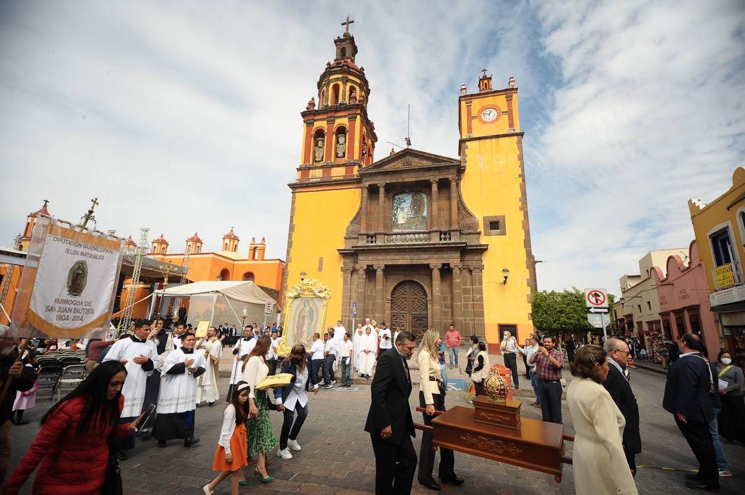 Ante feligreses reunidos en la Plaza Independencia, este viernes 19 de enero se llevó a cabo la ceremonia con motivo del 75º Aniversario de la Coronación de la Virgen de Guadalupe, evento al que –por invitación del obispo de la Diócesis de Querétaro, Fidencio López Plaza– asistieron la presidenta del Sistema Municipal para el Desarrollo Integral de la Familia (DIF), Georgina Sánchez Barrios, y el alcalde de San Juan del Río, Roberto Cabrera Valencia.