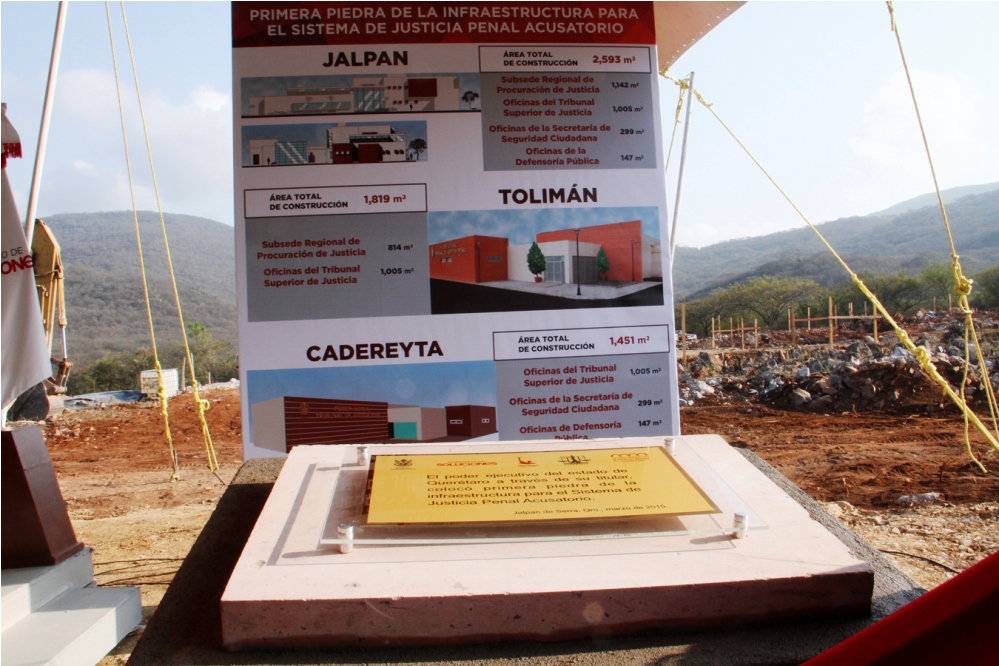 El Secretario de Desarrollo Urbano y Obras Públicas, José Pío X Salgado Tovar, explicó la conformación de la nueva infraestructura del Sistema de Justicia Penal Acusatorio para la zona serrana: “las obras de infraestructura que ejecutaremos en el municipio de Cadereyta, corresponden a instalaciones para defensoría pública, la Secretaría de Seguridad Ciudadana, el Tribunal Superior de Justicia, con una superficie de construcción de mil 451 metros cuadrados. En el municipio de Tolimán, la Subsede Regional de Procuración de Justicia, y las instalaciones para el Tribunal Superior de Justicia con una superficie de construcción de mil 819 metros cuadrados; en el municipio de Jalpan, la obra más completa para Defensoría Pública, para la Secretaría de Seguridad Ciudadana, la Subsede Regional de Procuración de Justicia, el Tribunal Superior de Justicia con una superficie de construcción de 2 mil 500 metros.