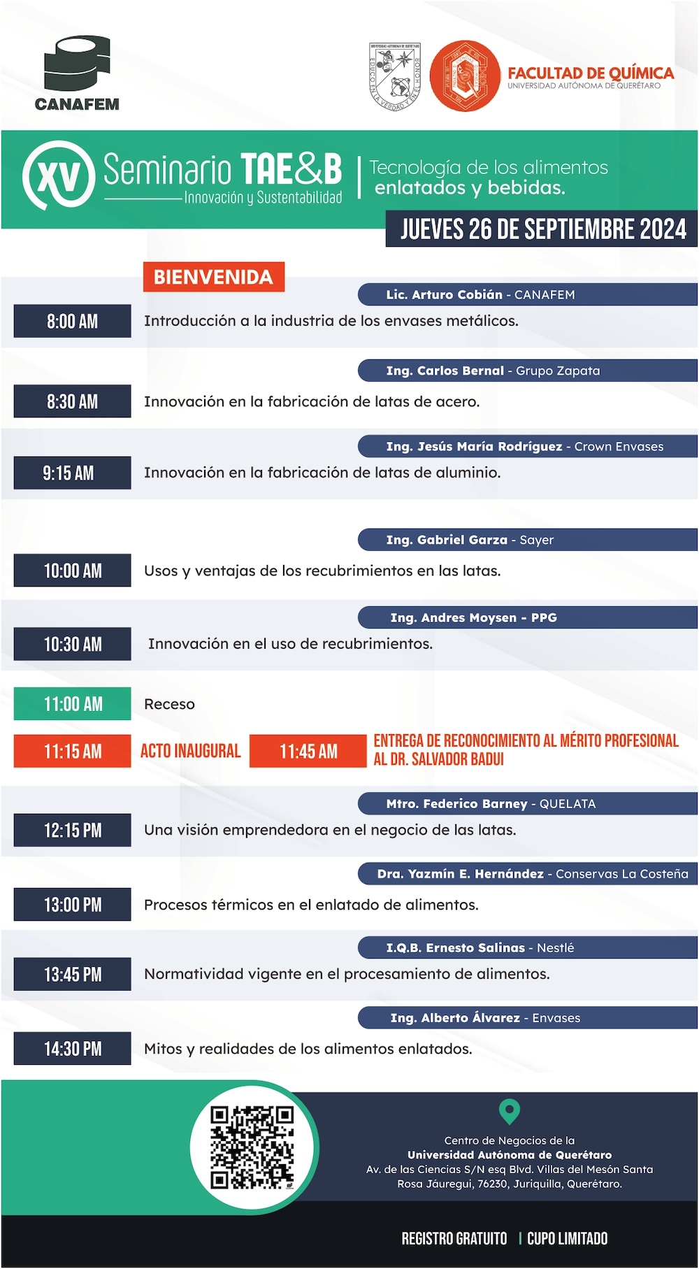 El próximo 26 de septiembre, la Facultad de Química (FQ) de la Universidad Autónoma de Querétaro (UAQ) y la Cámara Nacional de Fabricantes de Envases Metálicos (Canafem) desarrollarán en el Centro de Negocios Juriquilla la 15° edición del Seminario de Tecnología de los Alimentos Enlatados y Bebidas (TAE&B).