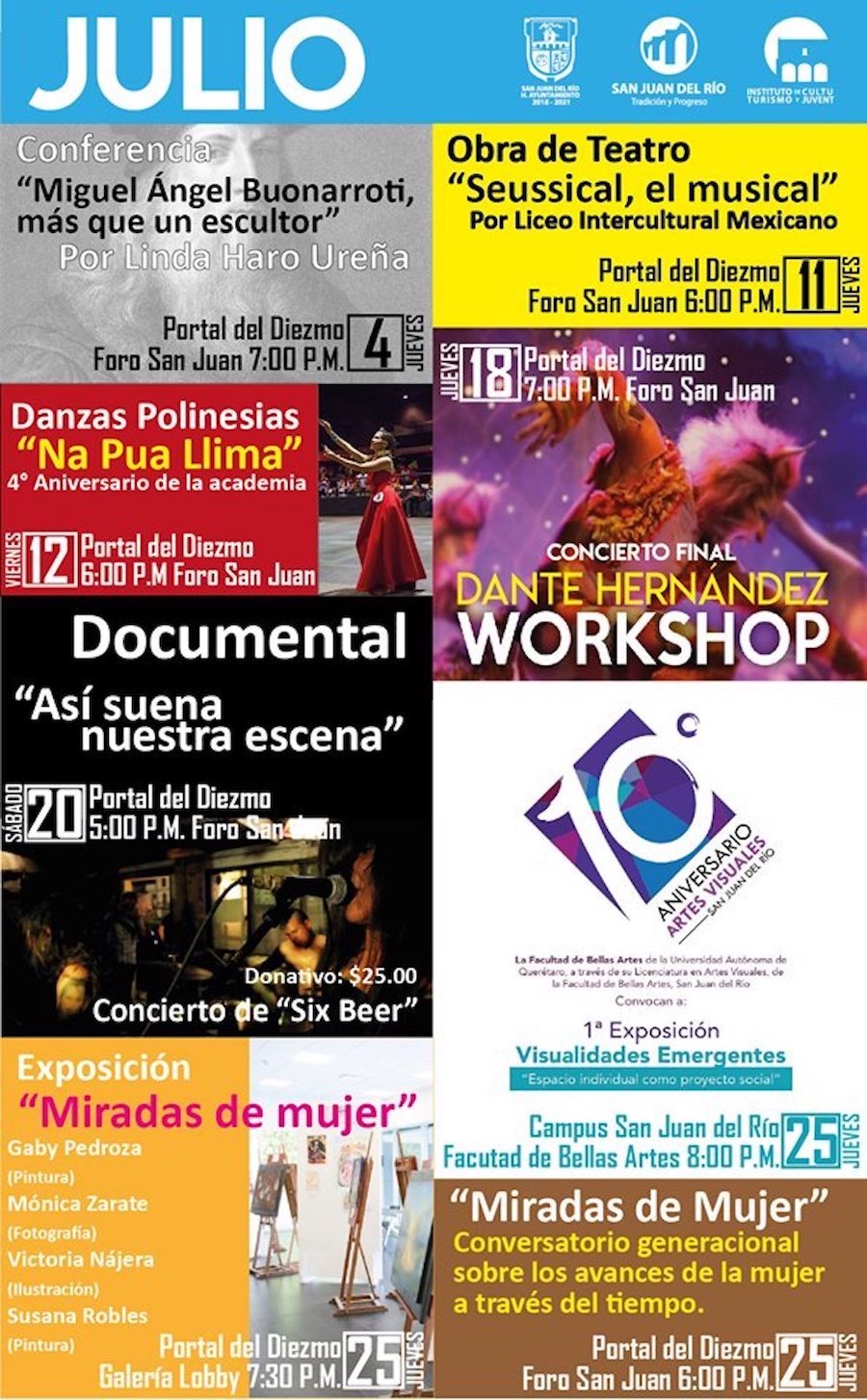 Para que la población sanjuanense disfrute de espectáculos culturales y artísticos de primer nivel, la Presidencia Municipal de San Juan del Río, a través del Instituto Municipal de Cultura, Turismo y Juventud, ha preparado una agenda de actividades como parte del Programa Cultural de Julio 2019.