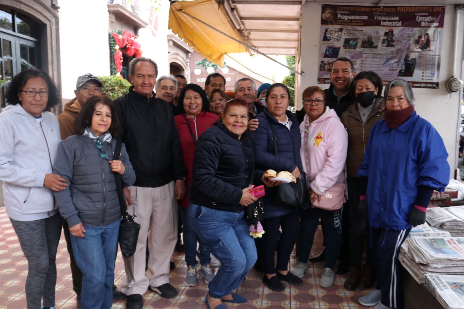 Este 6 de enero el presidente municipal de San Juan del Río, Roberto Cabrera Valencia, convivió con integrantes de la Unión de Voceadores Mauro Orozco Leal y de la Asociación de Voceadores Sanjuanenses A.C., con quienes, antes de su jornada de trabajo, compartió la tradicional rosca de Reyes y atole en un encuentro realizado en la zona de puestos de periódicos de avenida Juárez, a un costado del Portal del Diezmo.