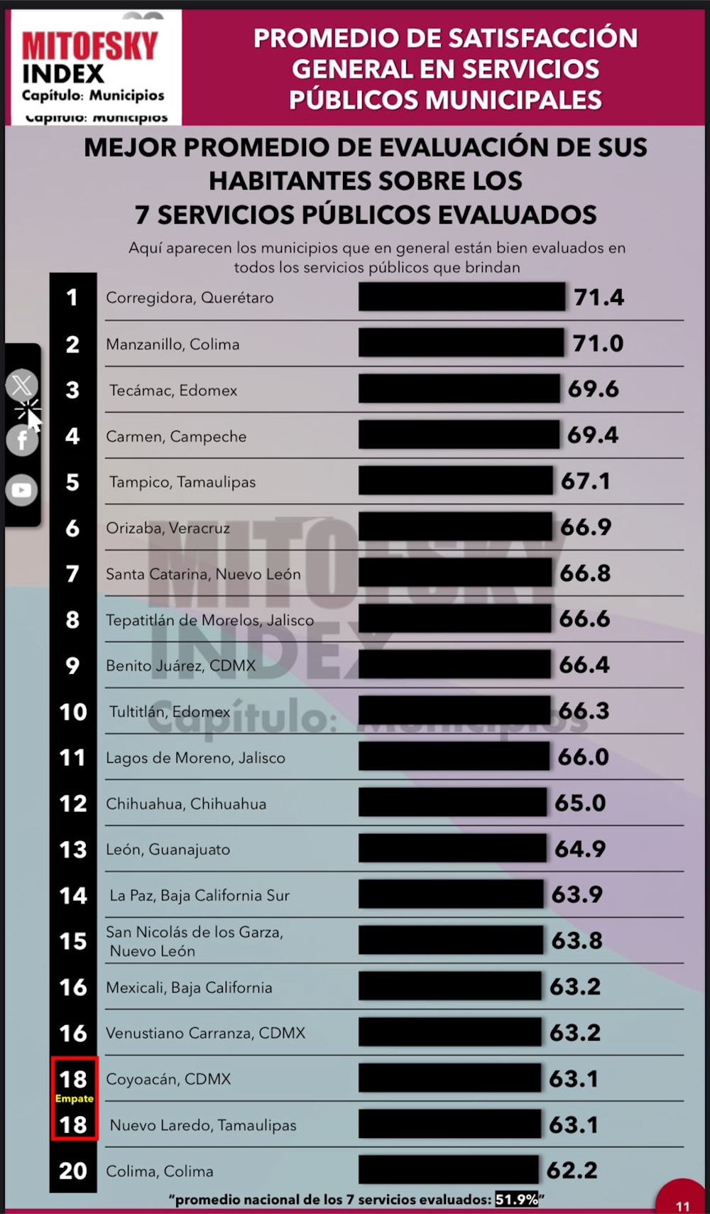 El municipio de Corregidora ha sido reconocido con el primer lugar nacional en el “Índice de Satisfacción de Servicios Públicos Municipales” de la casa encuestadora Consulta Mitofsky, al registrar el mejor promedio de satisfacción en los servicios públicos ofrecidos a sus habitantes, con un 71.4%. Esta evaluación se basó en factores clave como pavimentación, recolección de basura, agua potable, iluminación de las calles, espacios para el deporte y ejercicio, eventos culturales y artísticos, y limpieza de los mercados públicos.