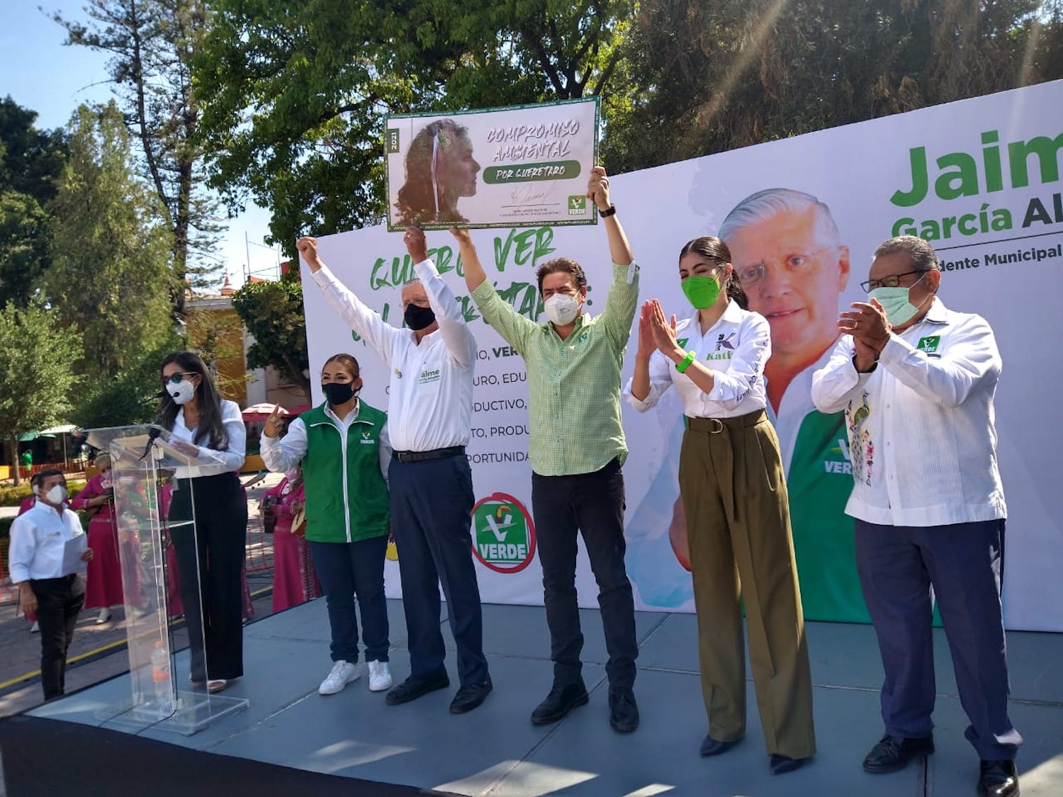 Jaime García Alcocer, candidato a la presidencia municipal de Querétaro por el Partido Verde, arrancó campaña esta mañana en el Jardín de la Corregidora, acompañado por el dirigente estatal, Ricardo Astudillo Suárez, y la candidata a la gubernatura, Katia Reséndiz Jaime, donde firmó el Compromiso Ambiental por Querétaro para, entre otras acciones, crear la Secretaría del Medio Ambiente en el municipio.