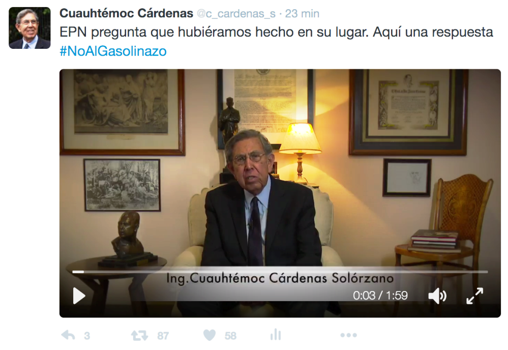 La tarde de este domingo, Cuauhtémoc Cárdenas publicó un video en su cuenta de Twitter en el que responde a Enrique Peña Nieto y dice #NoAlGasolinazo.