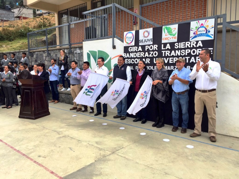 La secretaria de la Juventud, Tania Palacios Kuri, dio banderazo de salida al programa de transporte escolar gratuito denominado “Transporte a la Sierra”, en el municipio de Pinal de Amoles. Dicho programa permite a los jóvenes estudiantes del estado tener acceso de manera quincenal- durante el periodo escolar- a un servicio gratuito de transporte redondo desde el municipio de Querétaro y como última parada el municipio de Jalpan de Serra.