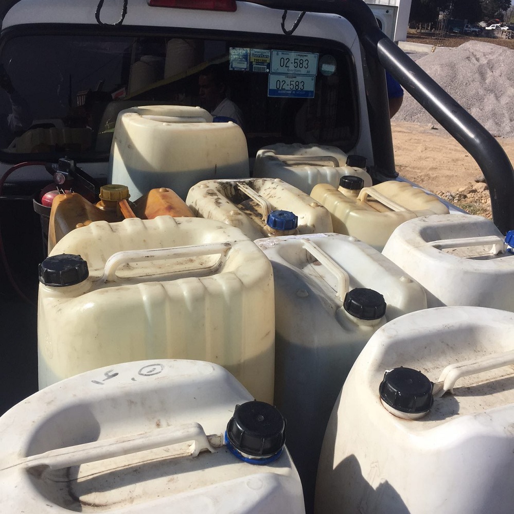 Resultado de un reporte al 066, la Unidad Municipal de Protección Civil, en coordinación con la Secretaría de Seguridad Pública Municipal, decomisó 22 contenedores con un total mil litros de una sustancia con las características del diesel.