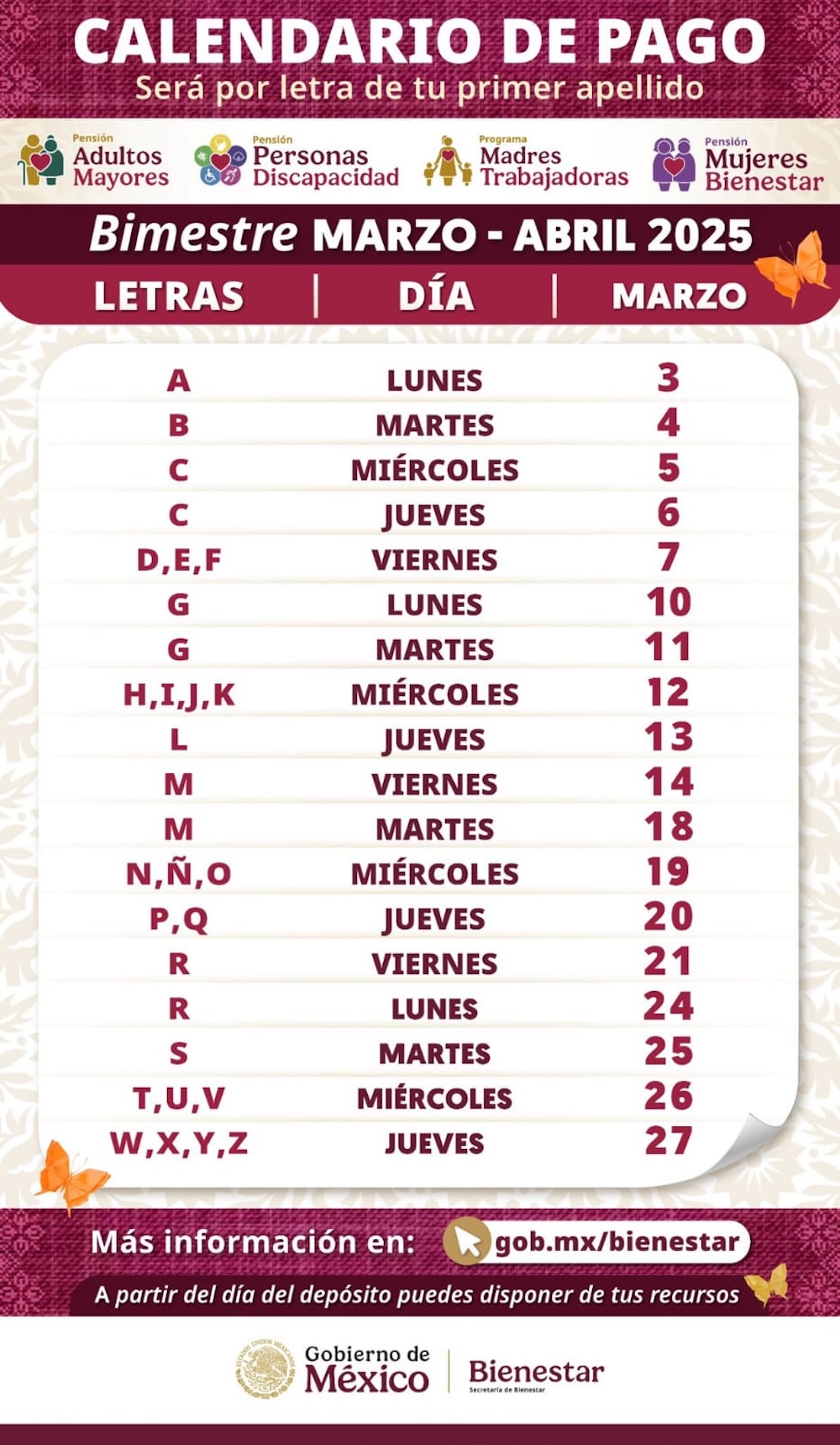 Señaló que, para brindar mejor atención, el depósito bancario se realiza de acuerdo con la letra del primer apellido del derechohabiente, bajo el siguiente calendario: