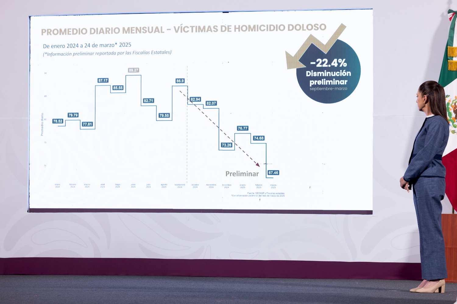 La titular del Secretariado Ejecutivo del Sistema Nacional de Seguridad Pública, Marcela Figueroa Franco, explicó que, de acuerdo con los datos preliminares de las 32 Fiscalías, la disminución en el promedio diario mensual de víctimas de homicidio doloso se debe a que pasó de 86.9 en septiembre 2024 a 67.4 en marzo 2025, lo que representa una reducción de 22.4 por ciento.