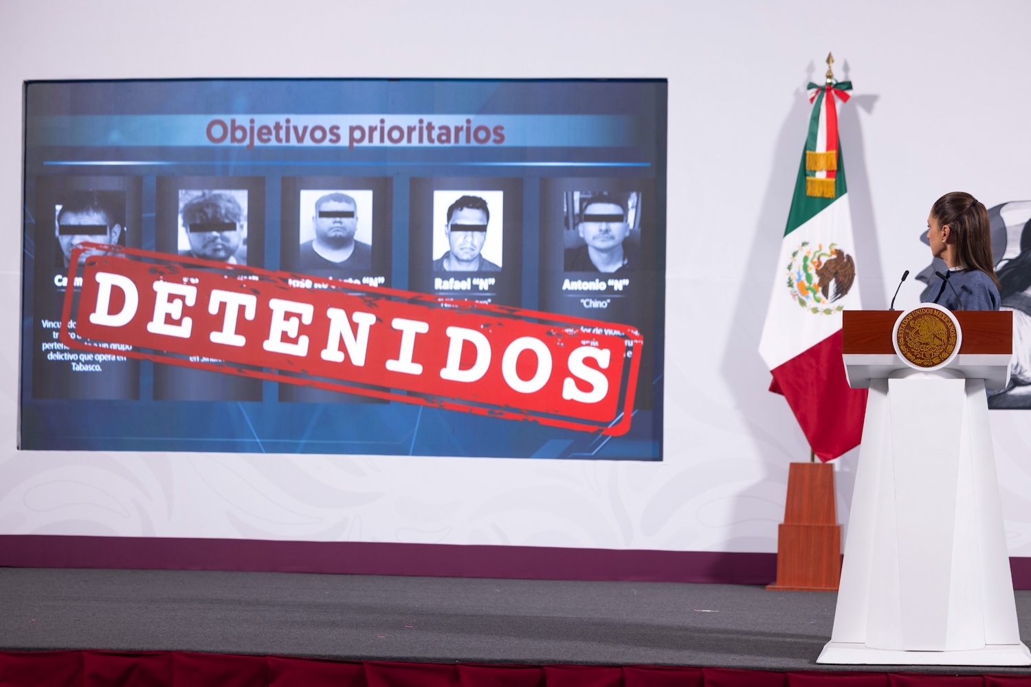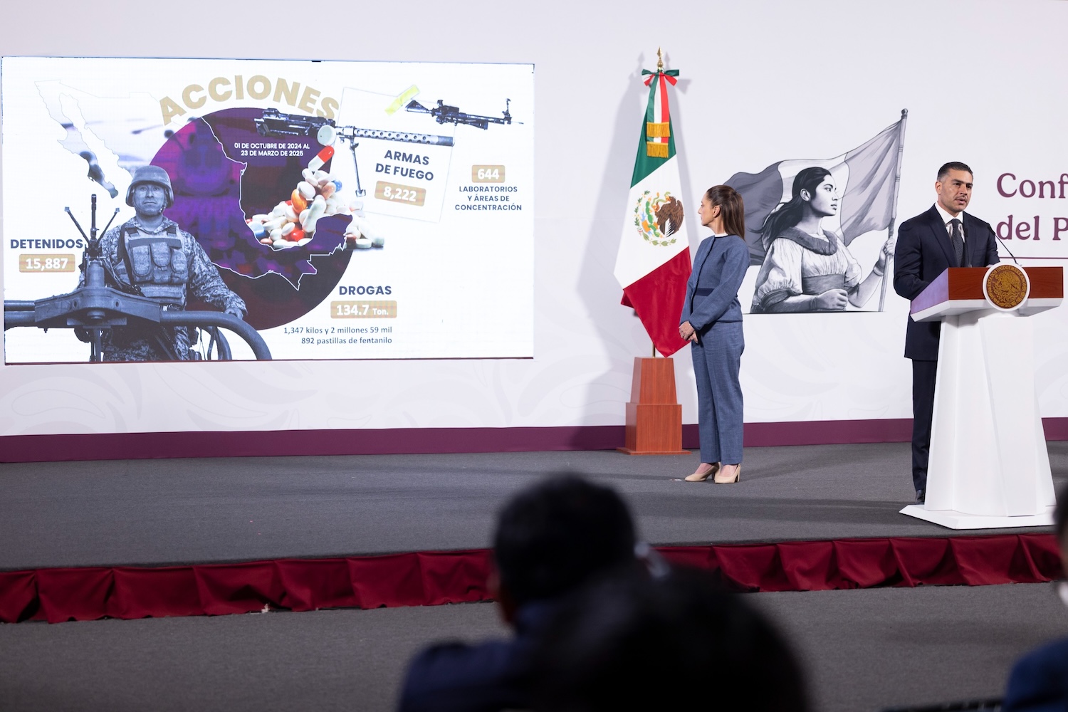 García Harfuch destacó que, en coordinación con la Secretaría de la Defensa, la Secretaría de Marina, el Centro Nacional de Inteligencia y la Secretaría de Gobernación, del 1 de octubre 2024 al 23 de marzo de 2025, se ha logrado la detención de 15 mil 887 personas por delitos de alto impacto; se aseguraron más de 8 mil armas de fuego; más de 134.7 toneladas de droga, incluyendo mil 347 kg y más de 2 millones de pastillas de fentanilo.