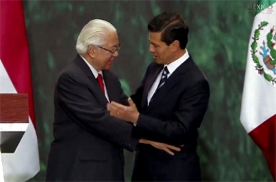 El presidente Enrique Peña Nieto dio la bienvenida a su homólogo de Singapur, Tony Tan Keng Yam, y destacó los acuerdos alcanzados para impulsar el diálogo político bilateral, fortalecer sus vínculos económicos, promover una relación cercana del sudeste asiático con Latinoamérica, y promover la ratificación del TPP.