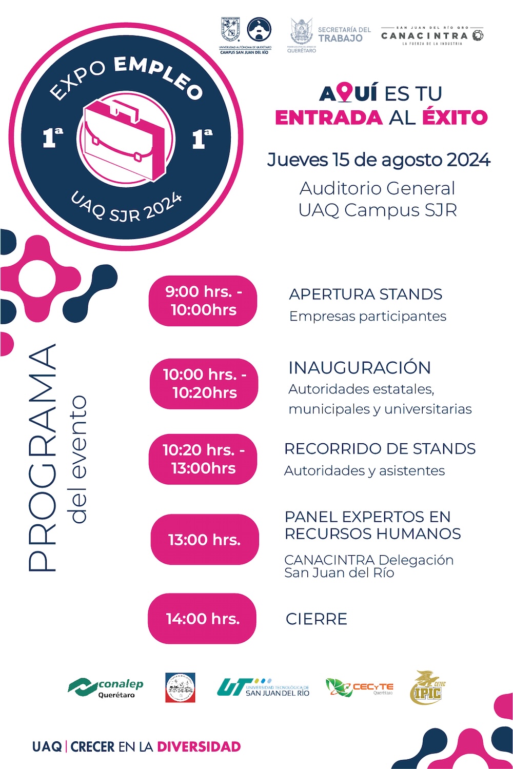 Con el objetivo de generar un vínculo directo entre el talento humano de la Universidad Autónoma de Querétaro (UAQ) y el sector público y privado, esta casa de estudios junto con la Secretaría del Trabajo del estado y la Cámara Nacional de la Industria de la Transformación (Canacintra) organiza la primera “Expo Empleo UAQ-SJR”, que se realizará el próximo 15 de agosto a partir de las 09:00 horas en el Auditorio General del campus San Juan del Río.