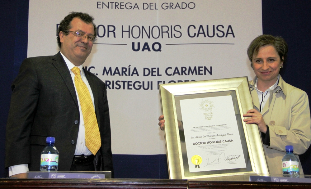 Por su trayectoria y honestidad en el ejercicio valiente del periodismo, la Universidad Autónoma de Querétaro distinguió a la Lic. María del Carmen Aristegui Flores con el Doctorado Honoris Causa. En Sesión Extraordinaria del H. Consejo Universitario el rector de esta Casa de Estudios, Dr. Gilberto Herrera Ruiz, entregó esta distinción a la comunicadora.
