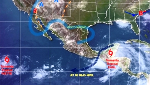 Earl se ubica a 260 kilómetros al sureste de Ciudad del Carmen, Campeche, a 335 kilómetros al este-sureste de Villa Hermosa, Tabasco, y a 185 kilómetros al oeste de Belice.