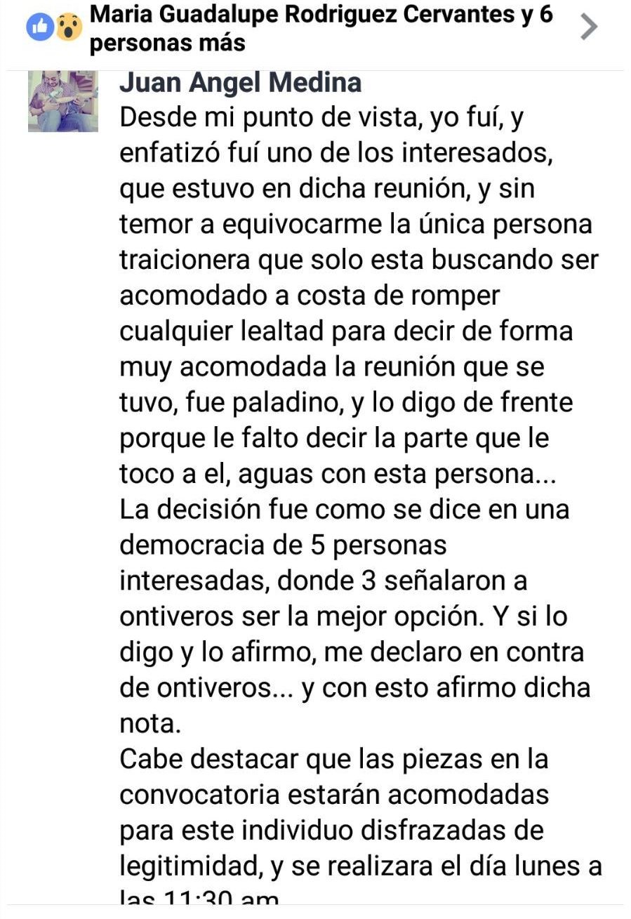 Juan Ángel Medina Morán manifiesta que, democráticamente, con tres votos, se decidió que Ontiveros sea el nuevo dirigente cenopista. Y con esto, subraya, “las piezas de la convocatoria estarán acomodadas para este individuo disfrazadas de legitimidad”.